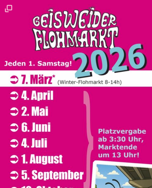 *Geisweider Winter-Flohmarkt: Platzvergabe ab 6:30 Uhr, Marktende um 14 Uhr.